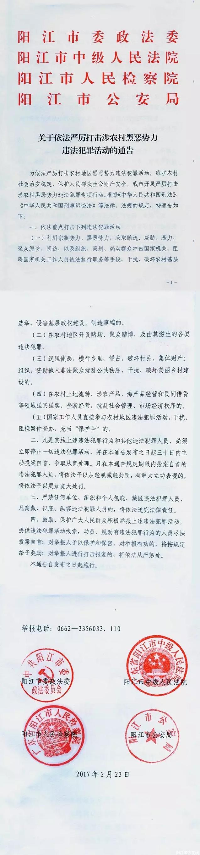 关于依法严厉打击涉农村黑恶势力违法犯罪活动的通告