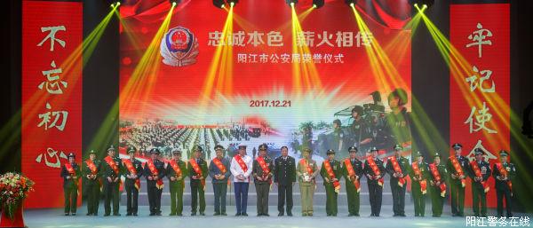 21日晚8时,在一个记录阳江公安30年不凡成绩的短片《神圣的使命 光辉的历程》中,市公安局“忠诚本色 薪火相传”人民警察荣誉仪式拉开序幕。随着一首《少年壮志不言愁》的唱响,市公安局民警为参加活动的人员带来了精彩纷呈的文艺节目。活动中,离退休民警代表和从警30周年民警代表被授予荣誉勋章,新警代表面对国旗进行入警宣誓。