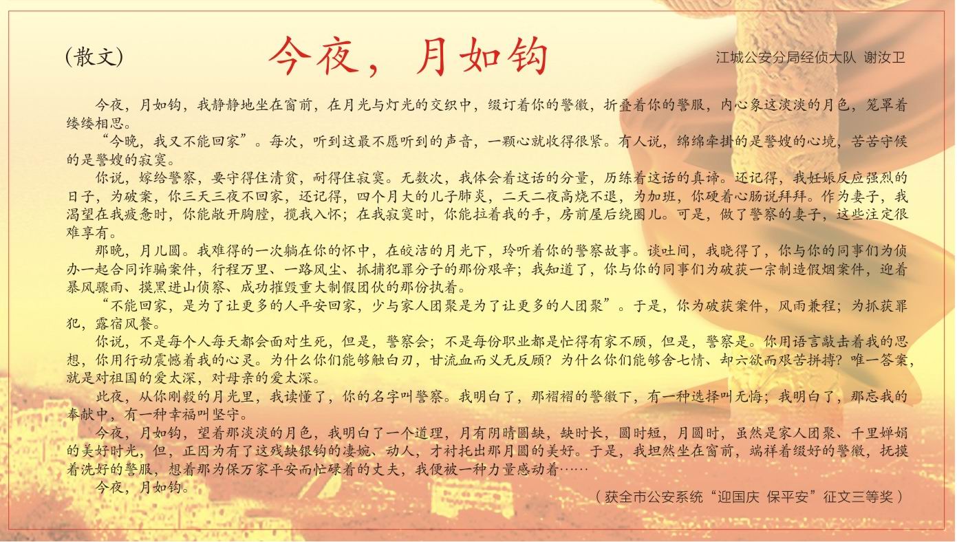 此夜,从你刚毅的月光里,我读懂了,你的名字叫警察。我明白了,那褶褶的警徽下,有一种选择叫无悔;我明白了,那忘我的奉献中,有一种幸福叫坚守。
