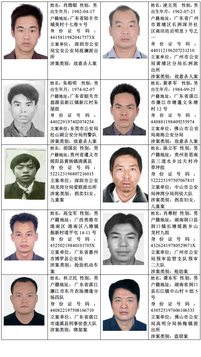 为进一步加大追逃力度,消除安全隐患,维护大运平安,广东省公安厅决定对以下10名重大刑事案件在逃人员进行悬赏通缉。任何公民发现以下逃犯请立即向公安机关举报,公安机关将对举报人资料严格保密。公安机关根据举报线索抓获在逃人员的,给予举报人5000元的奖励;对隐瞒包庇在逃人员的,依法追究法律责任;对打击报复举报人的,依法从严惩处。举报电话:020-83110906。